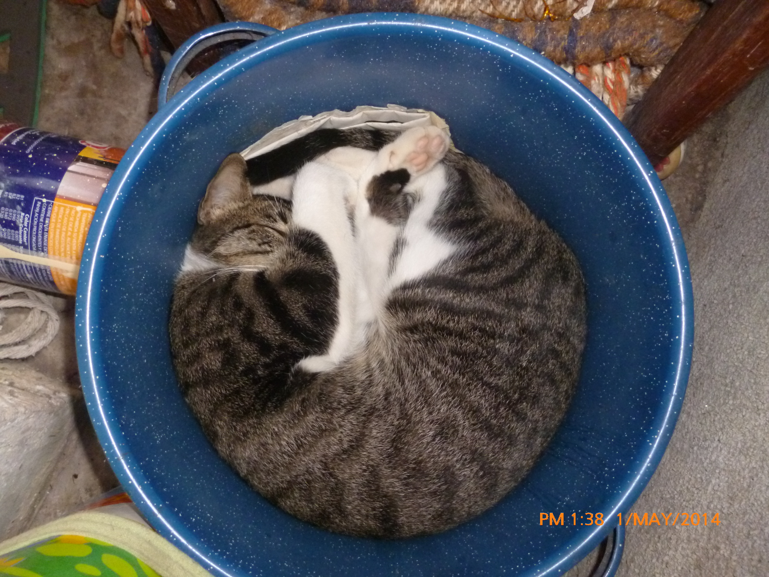 Nosotros, que somos bastante sensibles tratándose de animales, tomamos a los dos animales y los metimos a la casa… estaban todas mojadas las dos gatas (la madre y la hija)… así que las secamos con algunas telas viejas y las metimos en una caja de cartón y pusimos una ropa vieja y seca para que estuvieran calientitas…